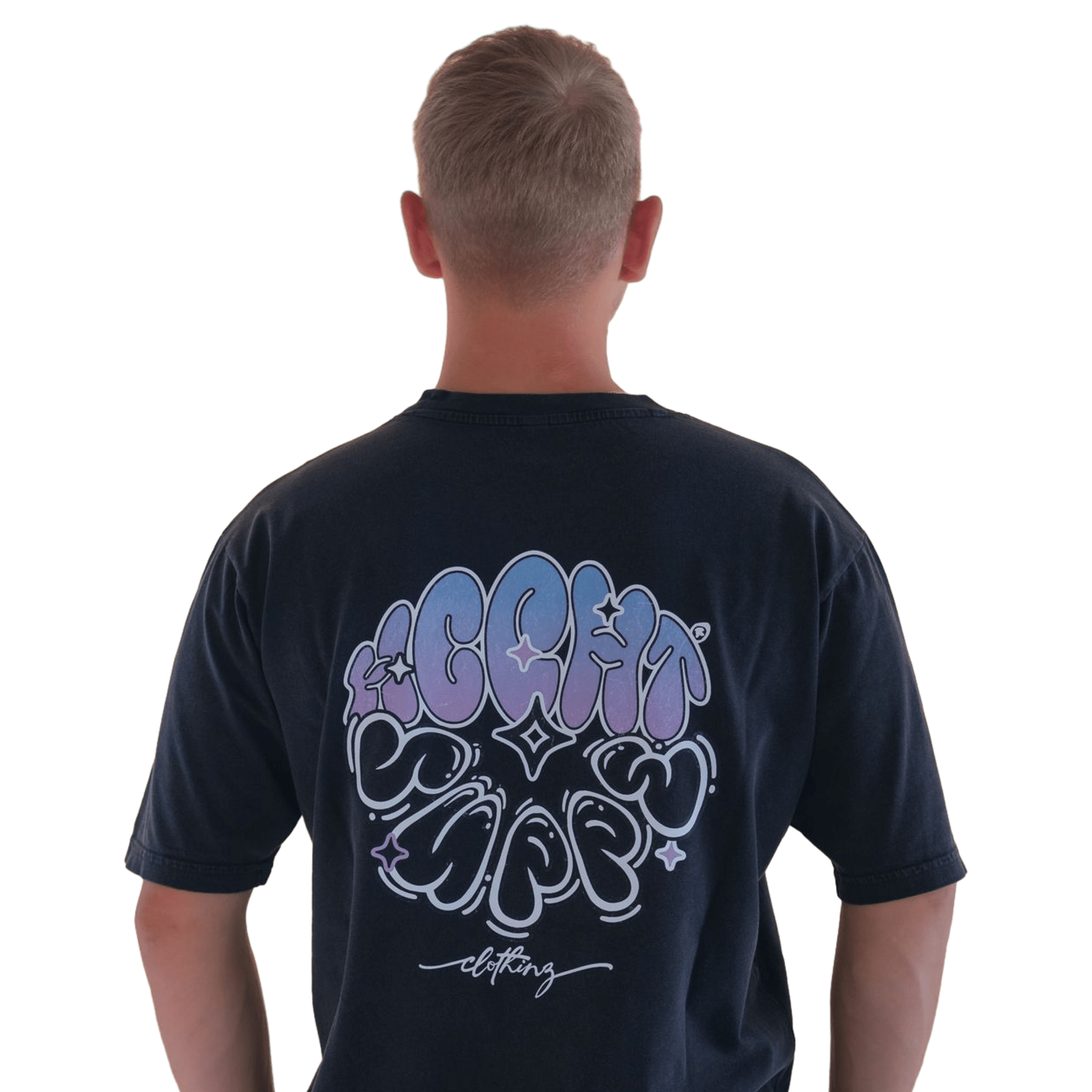 Der große Rückendruck im soften Gradient zeigt den ikonischen „Hechtsuppe“-Schriftzug in fließender Form, begleitet von kleinen Sternen und abgerundeten Shapes. Auf der Brust sitzt ein feiner, zentraler „Drift Mode“-Schriftzug, ebenfalls im verträumten Style gehalten. Leicht zu tragen – schwer zu übersehen.
